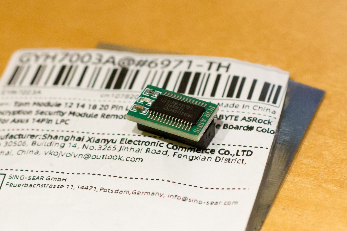 ・TPMモジュール(上記画像)は秋葉原では売っていないので、個人輸入。※amazonでも少々値が高くなるが、売っている。これをマザボに装着し、TPMを有効化